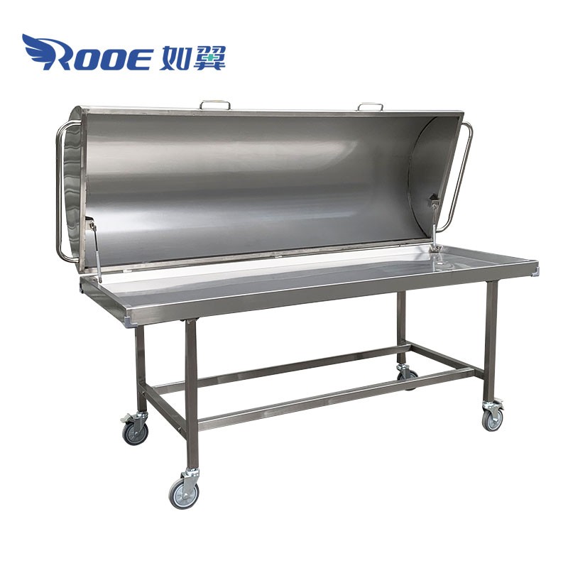 The Mortuary Transport Cart is a great choice for mobility, easy storage, and dust control. The unit comes with a stainless steel lid (two types of lids are available) that opens from one side via a gas spring. The Embalming Table with Lid allows for discreet transfer/transport of the deceased from the patient room to the mortuary. The Corpse Transport Cart gives the illusion of a standard empty gurney while hiding the body under a specially made lid.