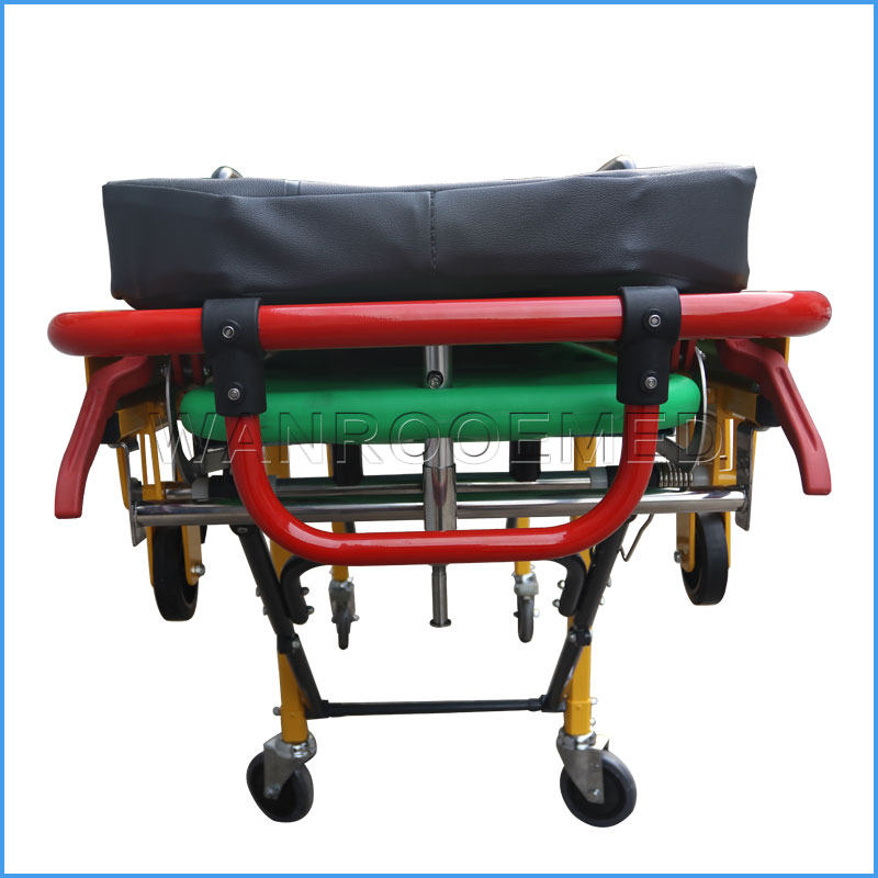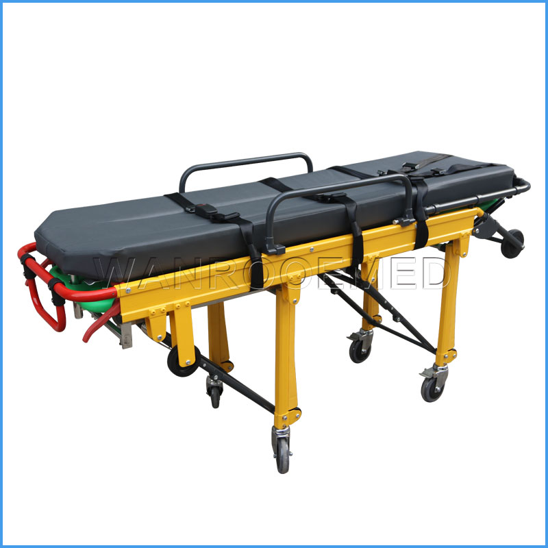 La junta es fundida por aleación de aluminio. Las patas plegables mecánicas son controladas por los mangos en ambos lados. La camilla con cerradura de seguridad, debe estar cerrada cuando transporte a los pacientes, y debe abrirse cuando suba a la ambulancia.