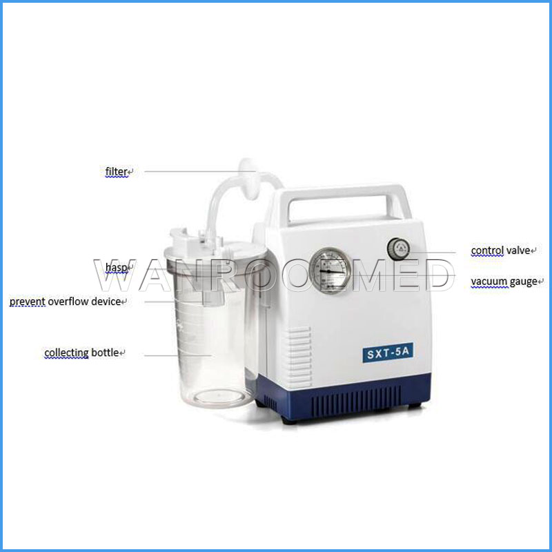 Portable Absorber l'unité de flegme Modèle SXT-5A est le haut vide / haut débit absorbé unité de flegme, et conçu pour aspirer divers mucus tels que grume et patients flegmatiques, les nourrissons ou les jeunes enfants de la gorge. C'est largement utilisé pour le traitement d'urgence dans divers hôpitaux, les conditions de premiers soins ou centre de service médical social.