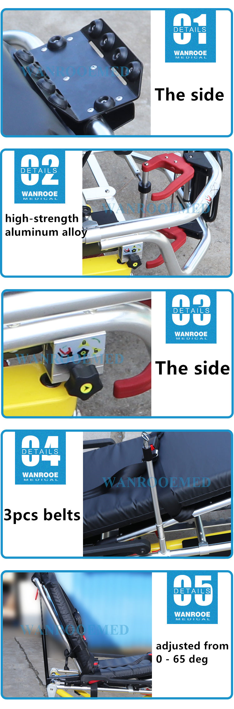 - Rails latéraux rabattables pour protéger le patient lors du transfert.