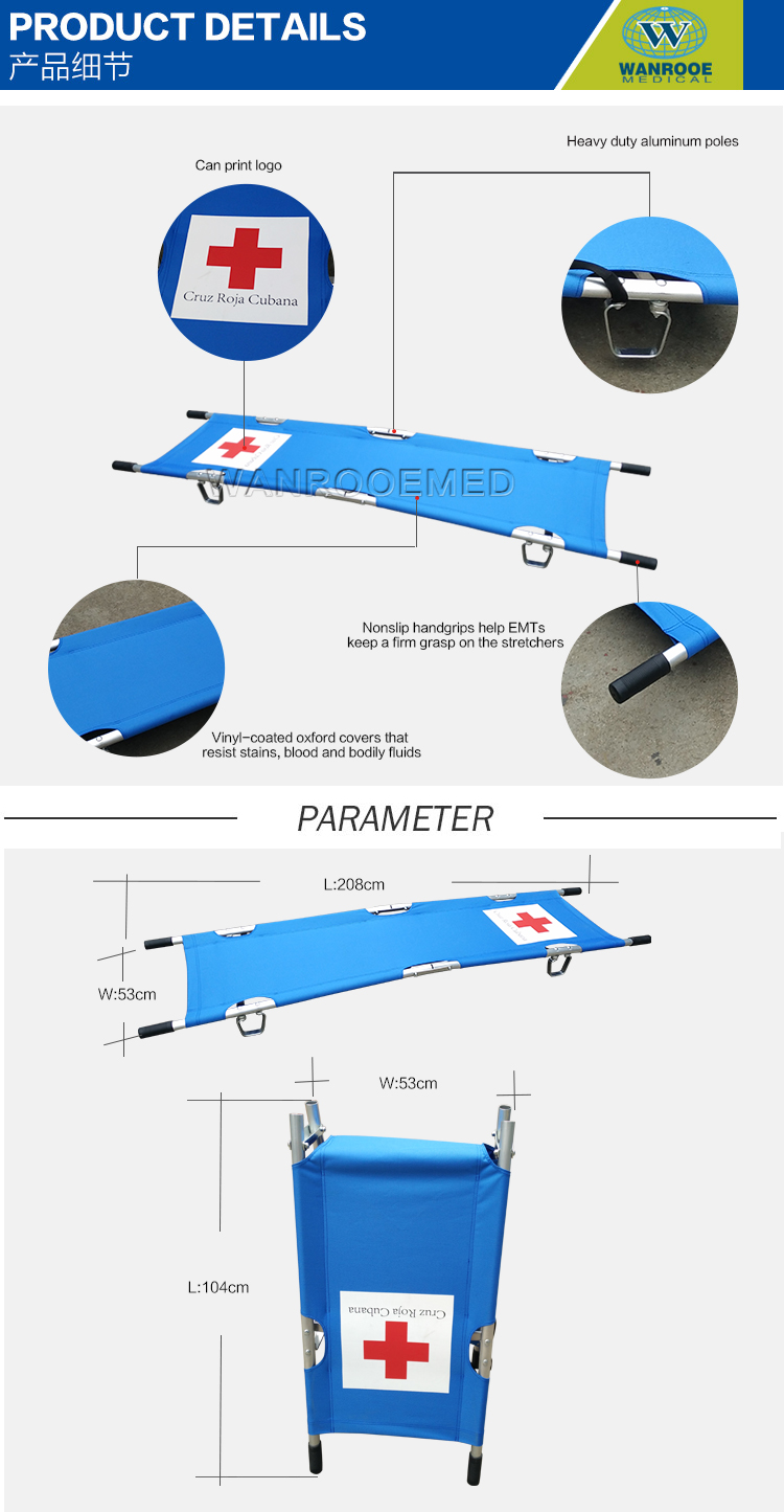 Il comporte des poteaux en aluminium résistants pour une manipulation facile et des couvertures Oxford enduites de vinyle résistantes qui résistent aux taches, au sang et aux fluides corporels. Barres d'écartement robustes et les jambes qui offrent un soutien. Les poignées antidérapantes aident les techniciens ambulanciers à tenir fermement les civières. Se replie longitudinalement et transversalement pour un rangement compact. Chaque civière comprend deux dispositifs de retenue du patient à libération rapide.