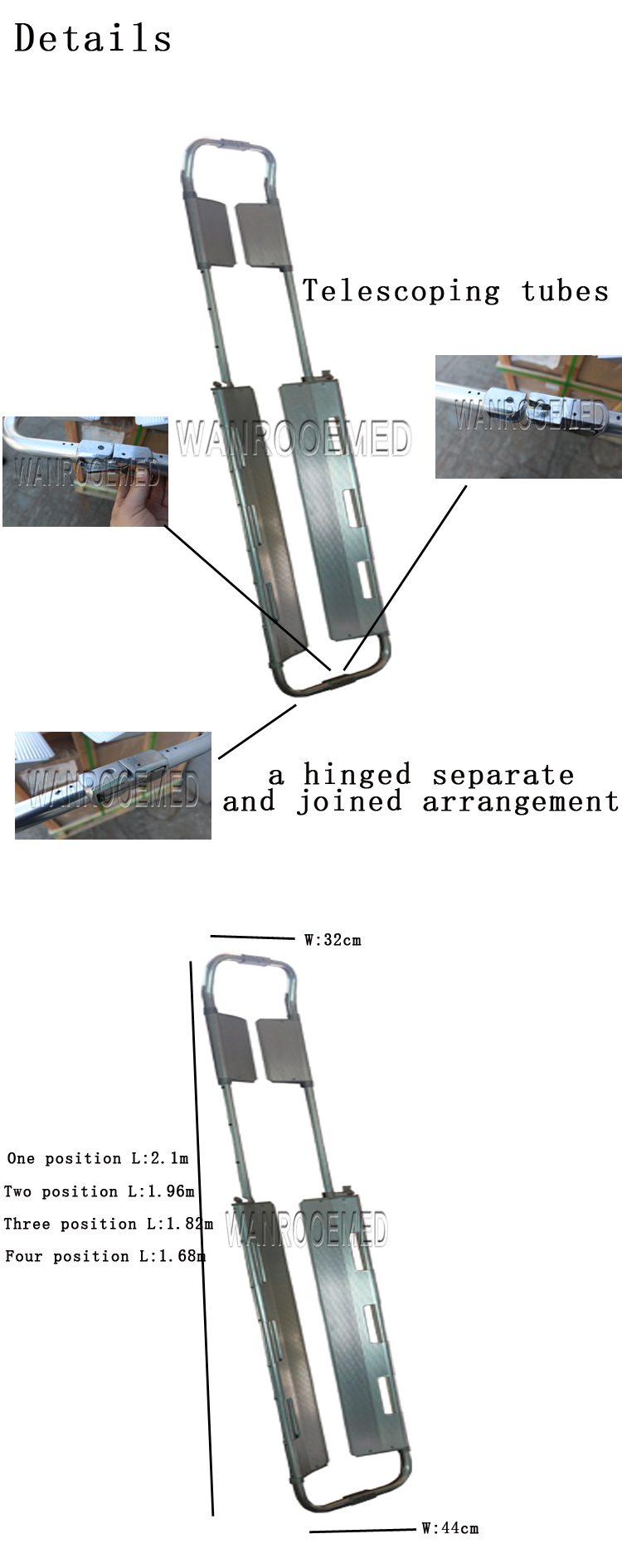 Aux deux extrémités de la civière, un arrangement articulé séparé et joint est placé dans le milieu, qui peut séparer la civière en deux parties, La civière pourrait renforcer les patients à la place d'origine qui pourrait réduire la blessure supplémentaire aux patients.