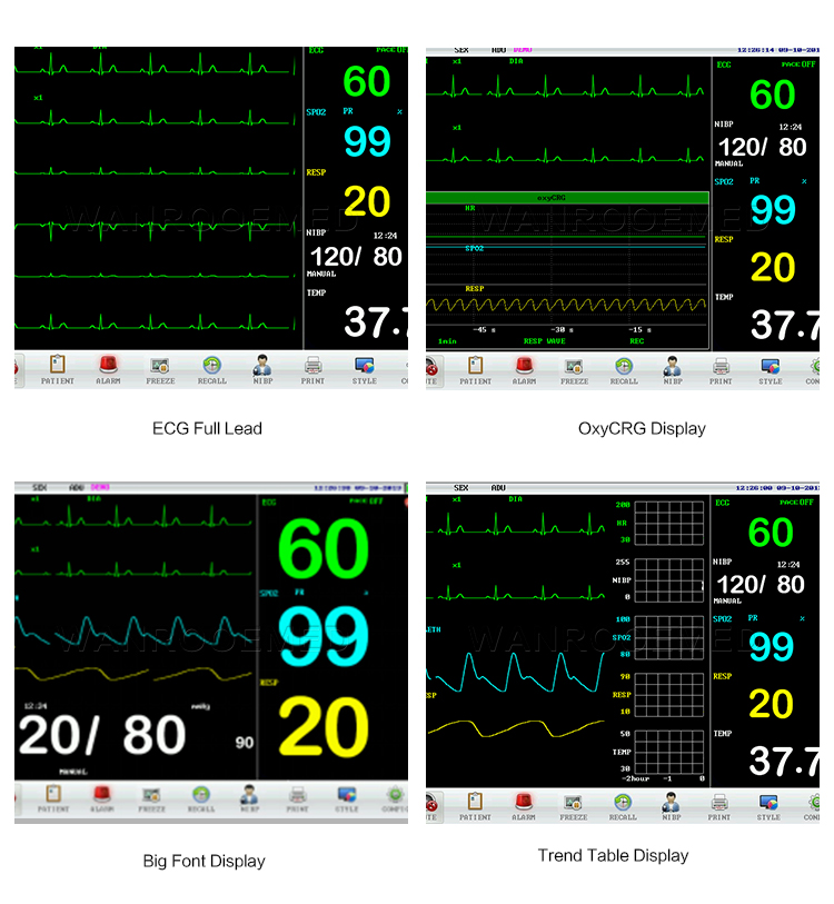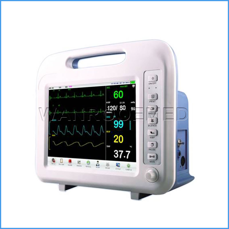 Caractéristiques: 1. Écran à DEL TFT couleur de 12,1 pi; 2. Alarme sonore et visuelle, 3. Mode d'affichage: standard, grande police, tendance PNI, table de tendance, ECG en dérivation complète, Oxy CRG; 4. Calcul du médicament et table de titration; 5. Convient pour la surveillance des patients adultes, pédiatriques et néonataux.; 6. Analyse en temps réel du segment ST, détection du stimulateur cardiaque et analyse de l'arythmie; 7. Prise en charge du stockage de 240 heures de données patient, de 1024 enregistrements PNI et de 1024 alarmes