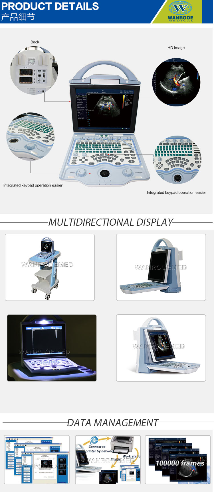 * Disque U (prise en charge de la gestion des fichiers, mises à niveau logicielles et magasin à clé unique) fonction), interface DICOM, gestion de données facile à utiliser par le médecin, transmission;