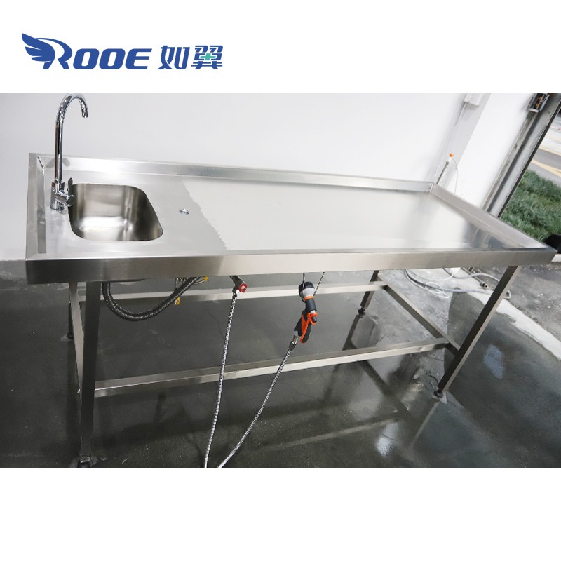 The anatomage table is suitable for washing and dressing the dead body. It is equipped with a sink with hot and cold water taps and a high-pressure spray gun. Different accessories can be customized. The concave design of the table top, combined with two sloped drainage grooves, can prevent sewage overflow and divert it to the pool for discharge through pipes. The stainless steel frame can be made of round tubes or square tubes, which can be flexibly selected according to the load-bearing requirements and budget. It is designed for forensic, pathological anatomy and clinical research laboratories, as well as funeral services, morgues and cemeteries.