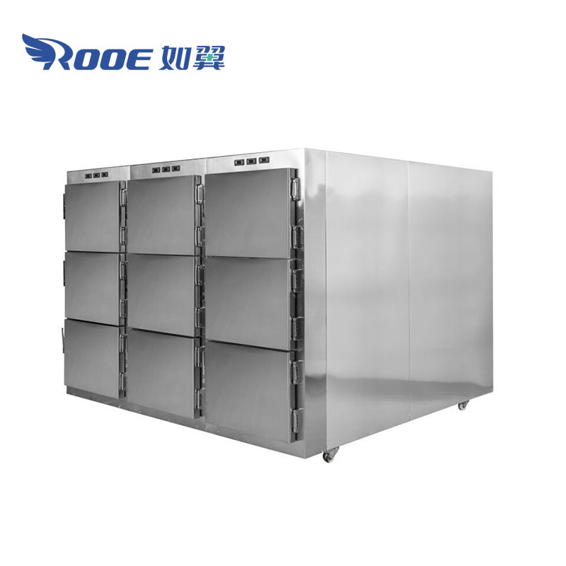 morgue and mortuary dead body freezer holds nine bodies and has three layers. Equipped with foam polyurethane, sufficient to maintain the specified internal temperature under specified environmental conditions. 9 morgue freezer Compressor system ensures accurate cooling temperature.Cooling system Provides complete back-up protection to the cooling system of the mortuary freezer or cabinet.In the case of dual cooling systems, each unit includes a central alarm system, microprocessor control, optical and acoustic signals. The standard temperature range of mortuary body fridges for storing a body is adjustable from 0 ºC to -10 ºC. The concave removal body tray comes with a rugged sliding system that ensures easy pulling out and back. Safety door locking system with lock key. Mortuary refrigerator fully assembled; Simply plug the device into a socket and the device can operate. Each dead body freezer box is fitted with 4 high quality universal wheels to ensure easy movement of the freezer.