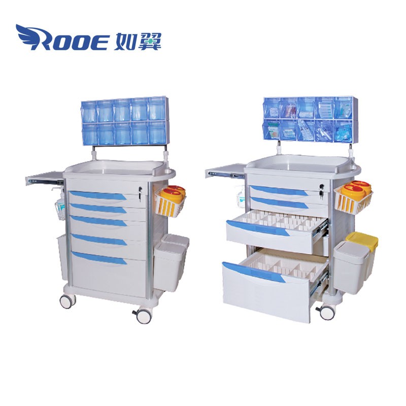 The ward cart is an excellent facility for caregivers. It has 5 layers of drawers. They come in different colors, red, white and blue. The medical supply cart on wheels has multiple shelving racks next to the body, where medical personnel can place large facilities. Four wheels make the emergency cart trolley move lightly and silently. Dumpsters and oxygen tank holders are also our features.Abs trolleys are of high quality and are essential products of Ward equipment.