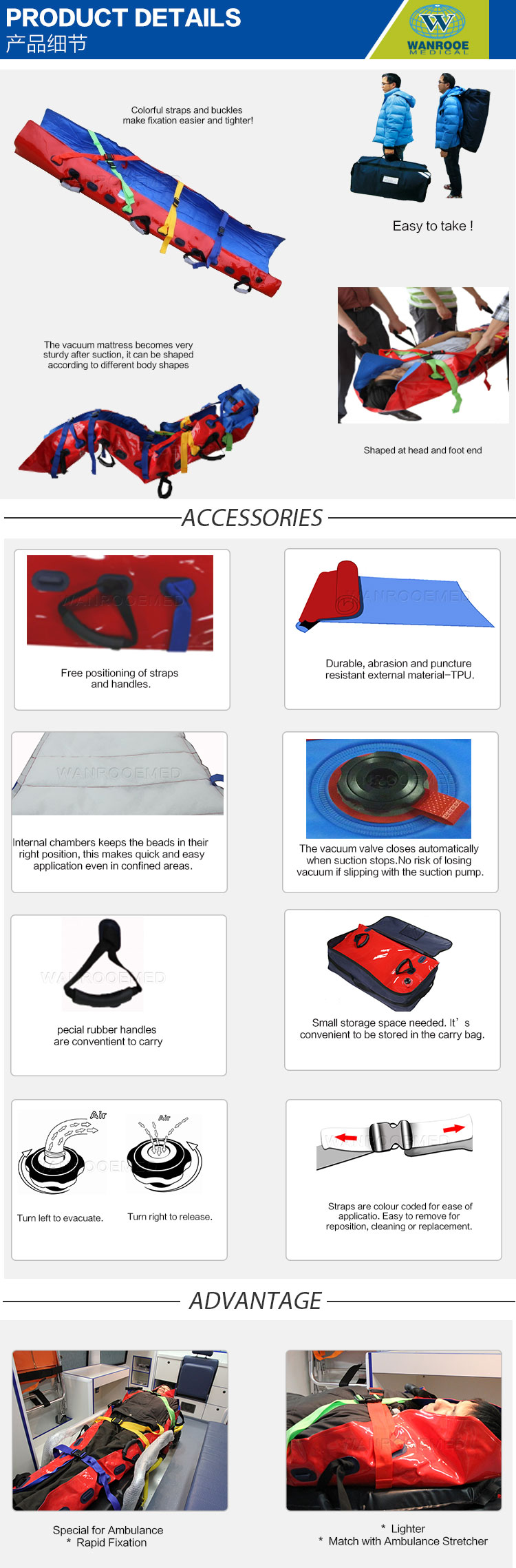 le Le matelas vide complet du corps immobilise le patient dans une position sécurisée comme il se conforme à toute forme de corps. WANROOEMED matelas à dépression adopter une technologie d'immobilité à cavités multiples qui uniformise les perles distribution et fixer le corps du patient rapidement en fonction de la forme du patient. Points de fixation multiples pour un transport plus sûr et plus pratique.