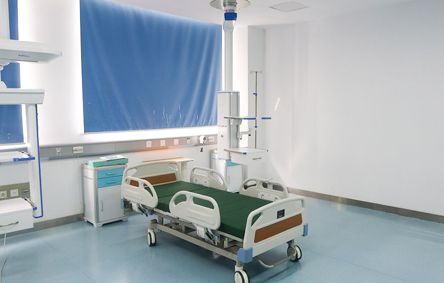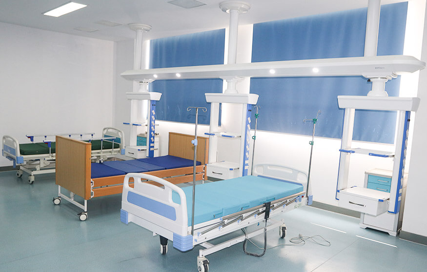 4.床上的天花板设有输液天轨,两三个自由移动输液吊架,床两边设有围帐或挂帘,当抢救危重病人时便于与其他床位隔开。