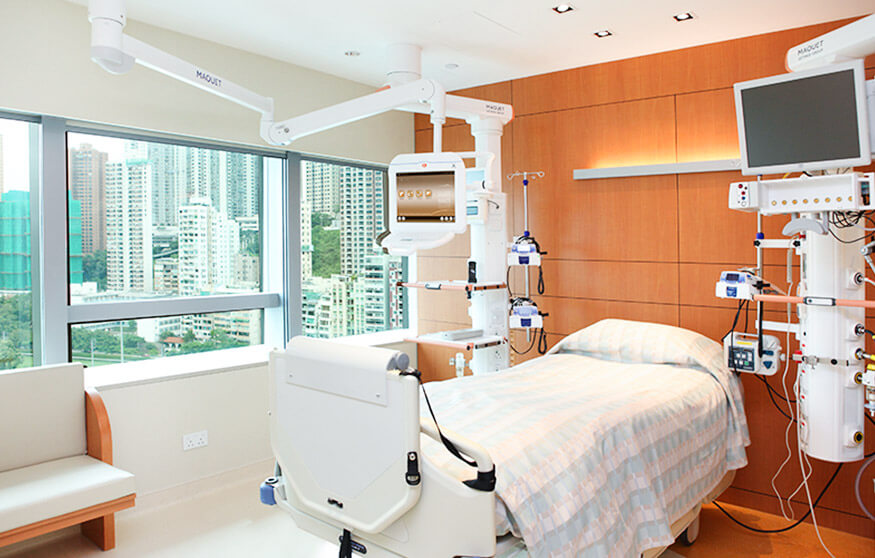 ICU的设备基本上围绕病床设置,目的是方便使用呼吸机、监护仪等多种电子设备、抢救设备。因此,每个床位的床头面板上设有:1个电源开关、可同时接 6~8个插头的多用途电源插座、2~3套中心供氧装置、2套压缩空气装置、2~3套负压吸引装置、1套亮度可调头灯、1套应急灯。两个床位之间设立一个两 面使用的功能柱,其上设有电源插座、设备搁架、气体接口、呼叫装置等。