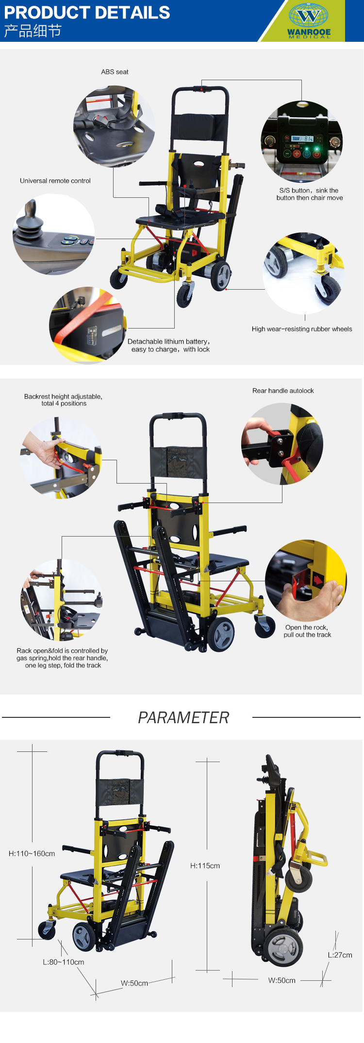 - La silla eléctrica para subir escaleras es ampliamente utilizada en el Hogar para ancianos, seguridad escolar, hospitales, hoteles, etc. para evacuación de emergencia.