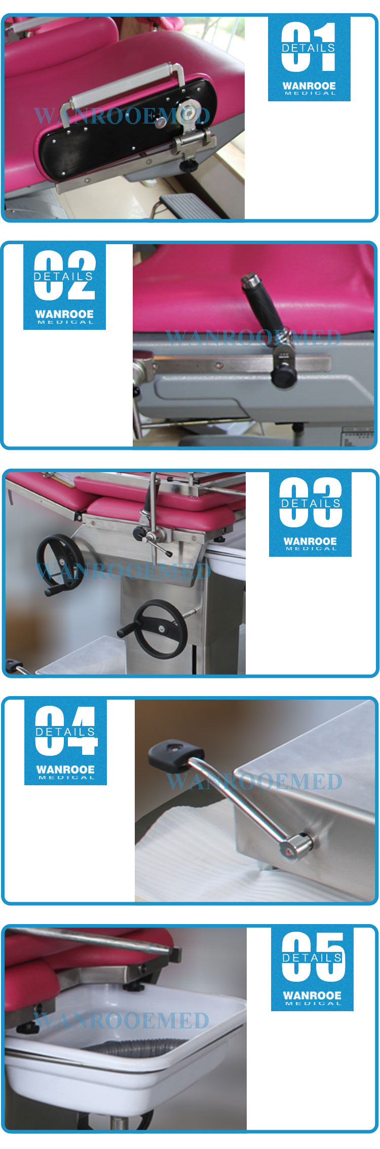 1. L'ascension et la descente sont contrôlées par une pédale; Trendelenburg et Trendelenburg inversé, la section arrière sont contrôlés manuellement, pas besoin de puissance.
