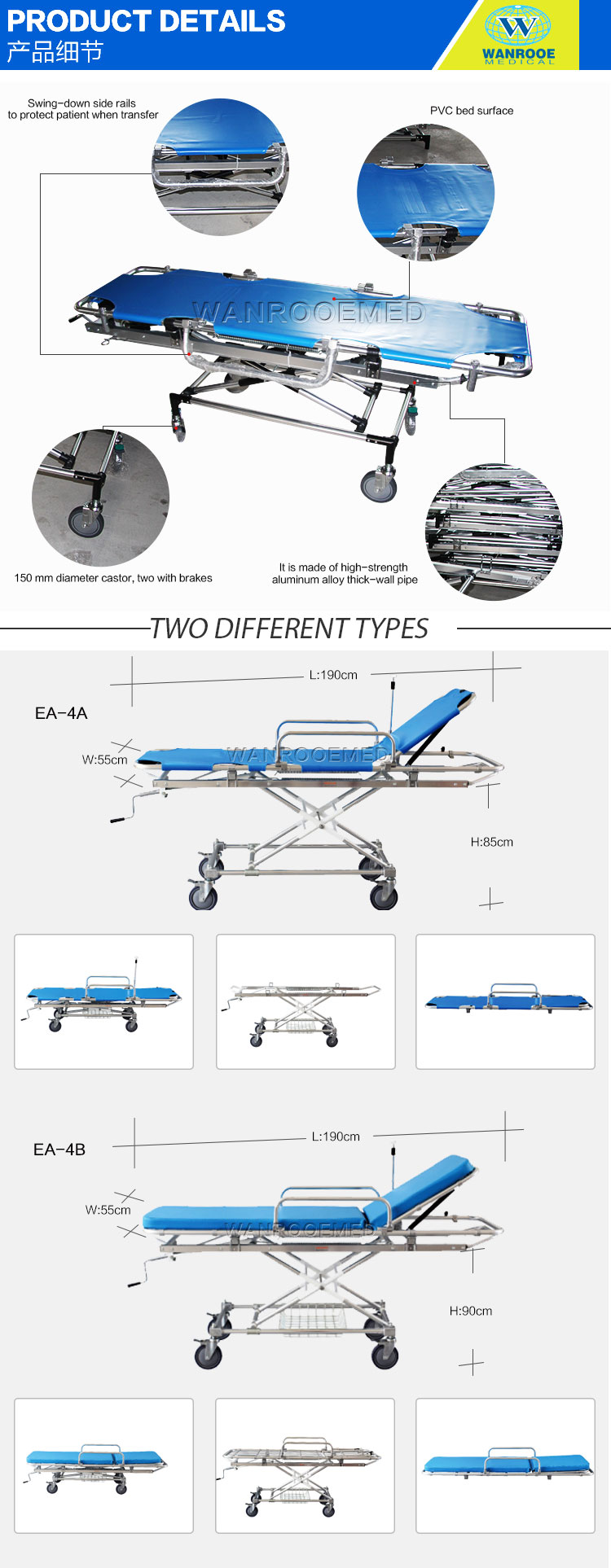 Civière d'ambulance en acier inoxydable de secours médical EA-4A