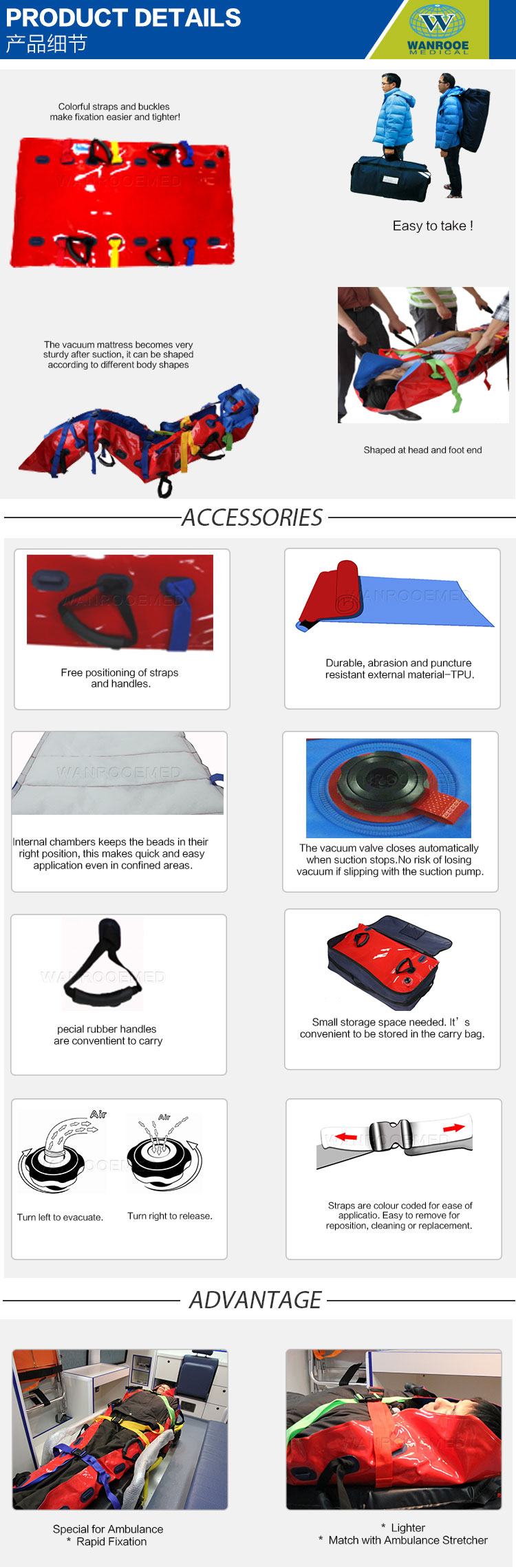 Le matelas vide complet du corps immobilise le patient dans une position sécurisée car il s'adapte à toutes les formes du corps. Le matelas à dépression WANROOEMED adopte la technologie d’immobilité à cavités multiples qui uniformise la répartition des billes et fixe rapidement le corps du patient en fonction de la forme du patient. Points de fixation multiples pour un transport plus sûr et plus pratique.