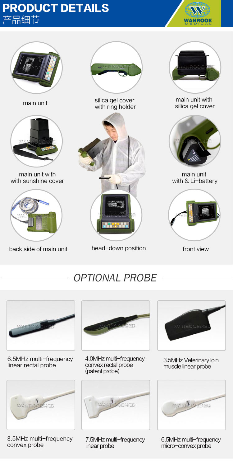 USRKU 10 peut être largement utilisé dans les diagnostics par ultrasons classiques tels que l'abdomen et la grossesse. Marché principal: contrôle de grossesse et aspiration folliculaire chez les gros animaux (bovins, équins, ovins, canins, félins, chèvres, porcs et lama).